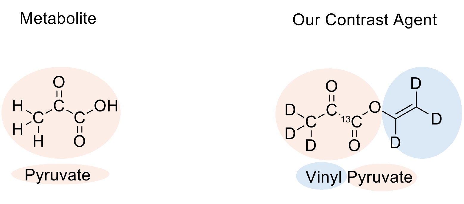 The problem: Pyruvate does not contain an unsaturated bond and therefore cannot be directly hyperpolarized using the PHIP method.
