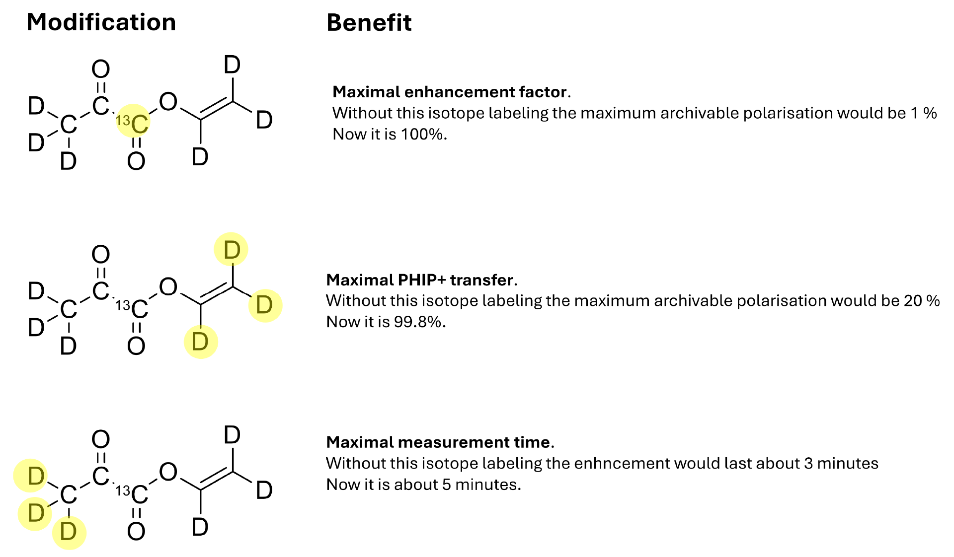 If you want truly exceptional signal enhancement, the vinyl arm alone is not sufficient. To achieve this goal, the side arm and the metabolite must be labeled with isotopes. Isotope labeling makes the synthesis even more difficult, so the best synthesis route to isotopically labeled vinylpyruvate that the research groups could use resulted in only a 3% yield.